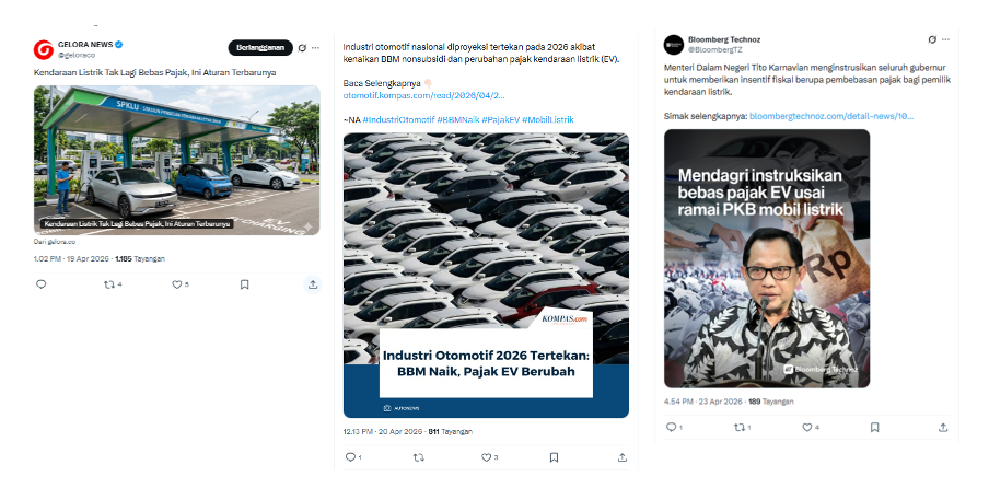 Percakapan di media sosial X terkait kebijakan pajak kendaraan listrik terpantau mengalami peningkatan setelah tanggal 19 April 2026, dan mencapai puncak pada tanggal 23 April 2026. Hal ini, berkaitan dengan instruksi Kemendagri kepada semua gubernur untuk membebaskan pajak kendaraan listrik.