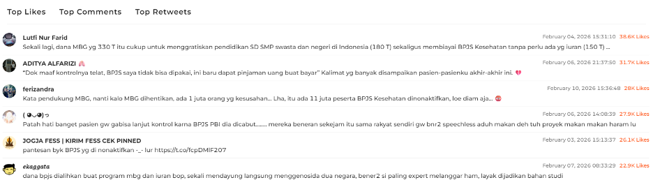 Daftar top tweet menunjukkan percakapan publik yang didominasi oleh kritik. Beberapa cuitan yang teratas menyoroti konsekuensi dari penonaktifan BPJS PBI, seperti pasien yang tidak bisa melanjutkan kontrol kesehatan, keluhan harus meminjam uang untuk biaya berobat, dan lainnya. Kekecewaan dan kemarahan terhadap negara juga ditunjukkan secara tajam.