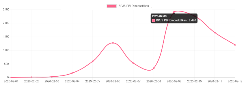 Pasca-puncak, tren pemberitaan menurun akan tetapi tetap berada di level yang relatif tinggi hingga 12 Februari 2026. Hal ini menunjukkan isu ini belum benar-benar surut dan masih mendapat perhatian dari publik sebagai persoalan kebijakan sosial yang berdampak langsung pada akses layanan kesehatan masyarakat rentan.
